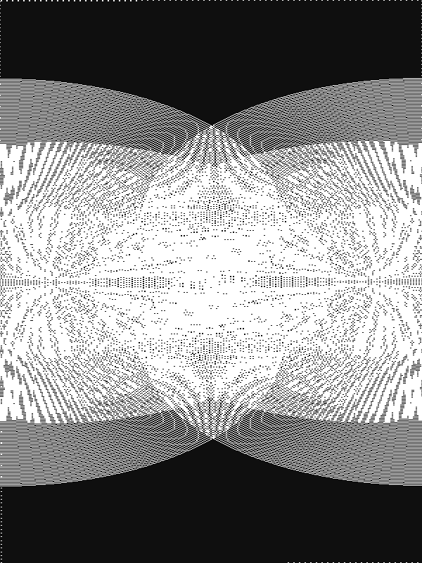 The "rippleweave" script (click "Show" in above Spoiler tag) takes less than 3 minutes to run to completion on my touch (booted from main). It is completely safe (other than consuming your time while you watch it run). As you can see in the code above, it ONLY writes to /dev/fb0 (the eink framebuffer device). This script disables screensaver mode using the method provided by thomass, but also pauses the framework to prevent framework status messages from polluting the artwork. The framework is resumed and screensaver mode reenabled after a completed screenshot image is saved to "rippleweave.raw" on the USB drive. You can convert the raw screenshot image to an 800x600 8-bit grayscale PNG file with IrfanView for Windows, or the Gimp or other favorite app in linux. Here is a full-size 800x600 (landscape mode) converted screenshot from this rippleweave script: Spoiler:
