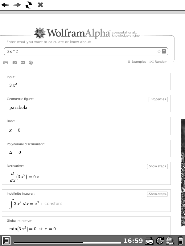 But before buying it, I will wait for some response about wolfram alpha web site compatibility: I can't understand by myself if computation (as linked above) is made by server or client and if the web site needs some kind of browser technology that doesn't work on M92. |