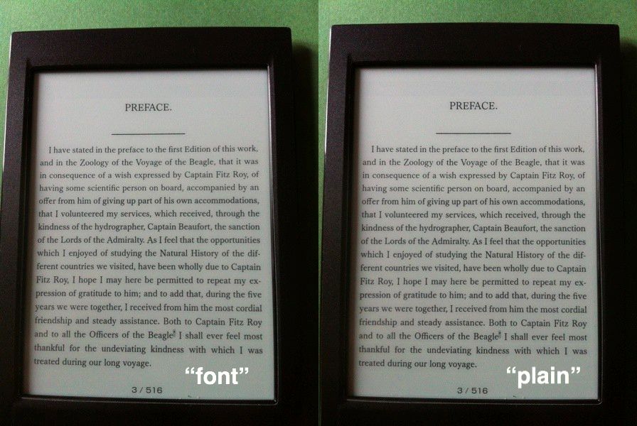 I'd be curious to know your impressions when that change is abstracted; would you mind trying with an EPUB that incorporates a font (e.g. Darwin's Journal of Researches, available at http://efele.net/ebooks/livres/000177/index.html; pick the "epub" version, not the "epub-"). As for the aggressive hyphenation: have you seen if there is a reading option to turn it off? Thanks in advance, Eric. |