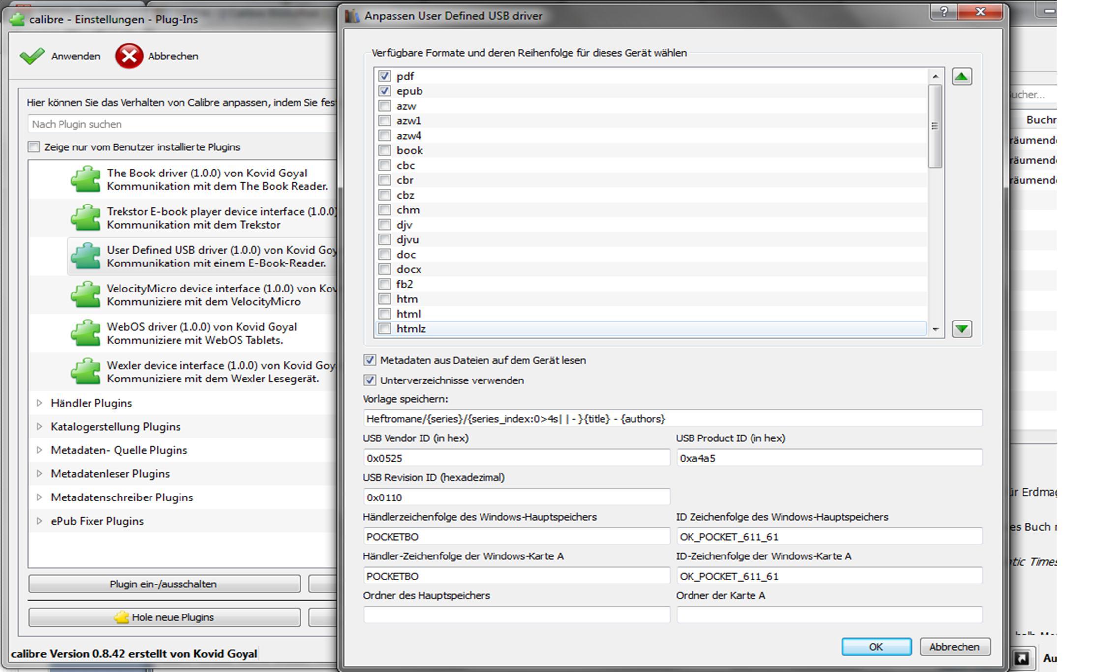 Die *.xps ist nur eine Hardcopy der Bildschirmanzeige des entsprechenden Menüs in Calibre. Hatte leider keinen pdf-Printer parat, deshalb mit Bordmitteln von Windows eben eine xps. Mehr nicht. Zip musste sein, da man xps nicht einfach bei Mobileread anhängen kann; deshalb der Kniff dem zippen. Du muß die passenden Einträge im Treiber hinterlegen. Für das PB360+ muß - abweichend vom PB 611 m. E. lediglich die ID-Zeichenfolge geändert werden in OK_POCKET_360+61. Rest sollte passen. Kann es aber mangels passendem Gerät leider nicht selbst probieren. @troll05 Das PB611 wird ja offiziell unterstützt, und trotzdem funktioniert es bei mir (und wohl auch bei einigen anderen) nur mit dem angepassten User-defined-Usbdriver. Beim TE scheint es mit dem PB360+ genauso zu sein. Warum auch imnmer...... Last edited by nobody66; 04-16-2012 at 04:56 PM. |