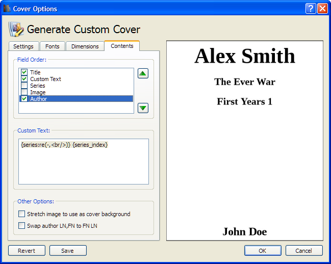 I'm looking to recreate all covers for 7000 books, since well... i messed up and don't like the current results ![]() I am stuck using regular expressions to "tweak" the output and i am having trouble with them. How would you write a RE telling it to "pick the title, but when you see a minus sign, delete it and skip one line" ? So that a book with Author "John Doe" and Title "The Ever War - First Years 1 - Alex Smith" Shows up as the second image (and not the first). Q : Kiwidude do you plan to add a "Right Margin" on your next release ? As text is already "auto-centered" getting a right margin would help getting it "where we want". PS : I have given up using Calibre series metadata because the field doesn't seem to be supported with Aldiko (my main reader). PS2 : Thx again for the amazing plugin |