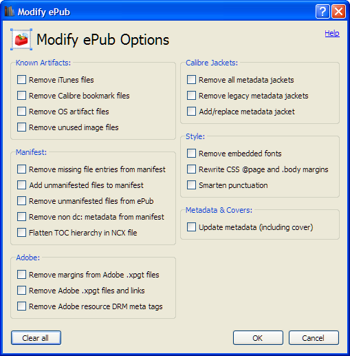 • Remove Adobe resource DRM meta tags - to strip some Adobe cruft of a <meta> tag from the html files.