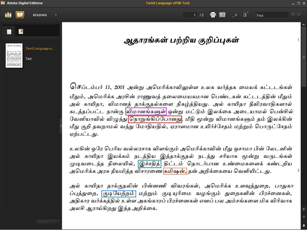 I converted html pages (from project madurai) to epub using sigil then I did embed with SUNDARAM tamil font. This works great on my nook. I was trying to convert tamil pdf into epub using calibre, but the fonts are messed up and I can't see font any more on my system, still I did embed with S08000F0.TTF font that you have used on your test epub, but no success. It'll be a great share if you can explain a bit brief on this issue. |