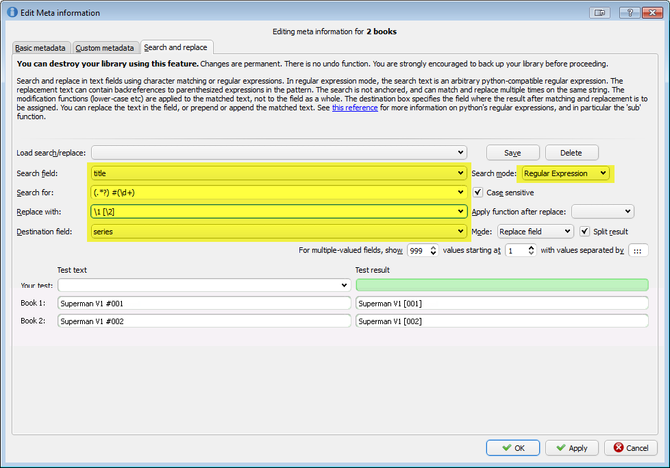 I have a number of comics that I have just imported into calibre. I have them listed by title as 'name v1 #xxx' and would like to use that as the series using the Search and Replace tab in the edit metadata bulk screen. For example title = 'Superman v1 #139' I would like the series to be 'Superman v1 [139]'. For the search field I selected title and 'superman v1 #[0-9][0-9][0-9]' and then series as the destination. I tried a couple of variations on 'superman v1 [0-9][0-9][0-9]]' as the replace with mask but nothing seemed to work. Is thsi possible? I so what do I need to change?