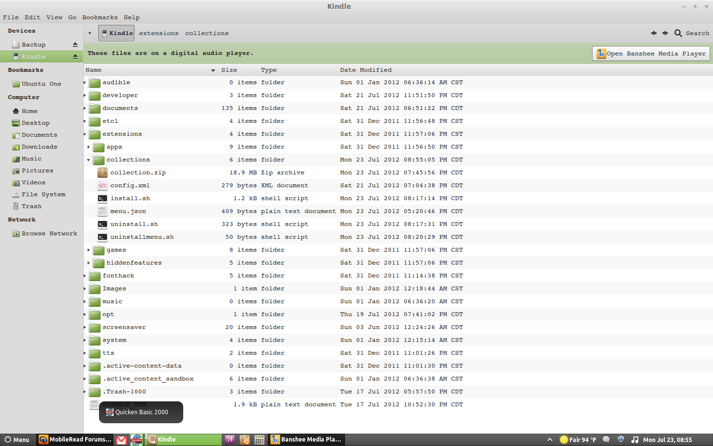 Update: I have built an install/uninstall launcher for it so all you have to do is copy over an extension folder. The install will be over when the kindle startup screen shows up. (If it does not show up after a minute it did not work...) Uninstall is almost instant so the only prompt will be the missing collections from the gui launcher. Uninstall Menu removes the installer scripts and files. All you should have to do is copy the launcher to extensions. If you have any problems please comment, also check list for new additions. Thanks for using this . Hope I saved you some time.