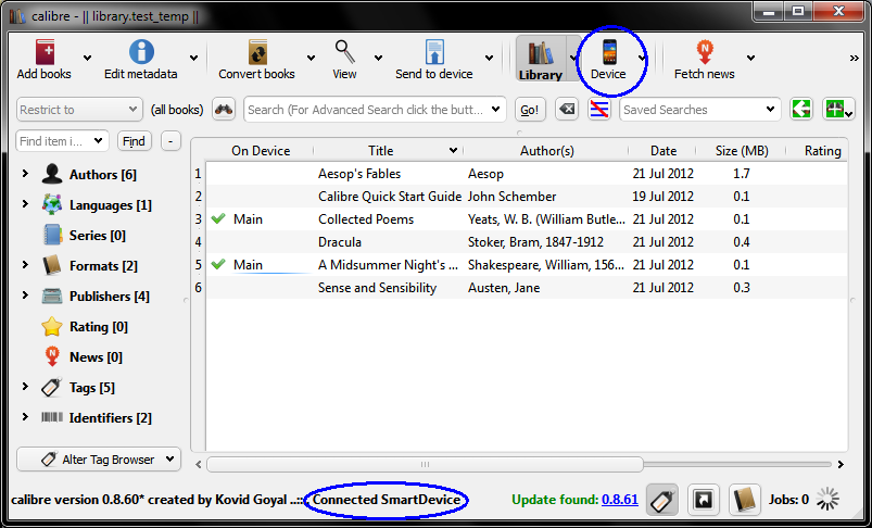 We don't yet have screen shots for the app that are ready to share. The attachment shows the calibre screen when the app has connected as a device. This Android app, including both the calibre device and the content server interfaces, will be priced at $2.99. It will be available (we hope) before the middle of August, initially on Google Play (ex Android Market). It will be available on Amazon's App Market once the necessary approvals are obtained. Comments? |