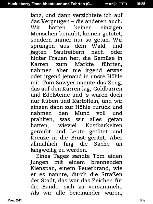 Without hyphenation and "stupid" justification you often get really ugly holes in stretched lines. That is of course more of a problem in languages like German where there can be quite long words. So they solved a problem "ugly holes in justified text" by going down a road that - to my knowledge - no typographer has ever done as every typographer knows how to hyphenate. Strange and annoying but still a creative solution. ![]() BTW, if you look at the promotional images of the Kindle Touch, you'll see that the English images are carefully chosen not to display this pseudo-justification: http://is.gd/fsudaS Whereas the German images show the complete fail in regards to hiding the bad typography: http://is.gd/UxQN7K And this in the country that was once a forerunner of good typography. Ah well, it has been going downhill anyway with typography after Gutenberg printed his first book.