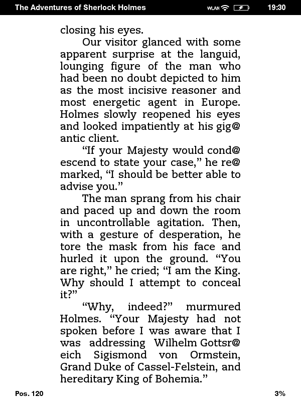 Without hyphenation and "stupid" justification you often get really ugly holes in stretched lines. That is of course more of a problem in languages like German where there can be quite long words. So they solved a problem "ugly holes in justified text" by going down a road that - to my knowledge - no typographer has ever done as every typographer knows how to hyphenate. Strange and annoying but still a creative solution. ![]() BTW, if you look at the promotional images of the Kindle Touch, you'll see that the English images are carefully chosen not to display this pseudo-justification: http://is.gd/fsudaS Whereas the German images show the complete fail in regards to hiding the bad typography: http://is.gd/UxQN7K And this in the country that was once a forerunner of good typography. Ah well, it has been going downhill anyway with typography after Gutenberg printed his first book.