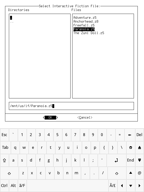 Also included are files so you can use it with the Kindle Unified Applications Launcher (KUAL, see below). It will add a "Start Frotz" option that includes a file selector dialog. This is optional, but without it you'll have to start kterm then type stuff to start frotz.