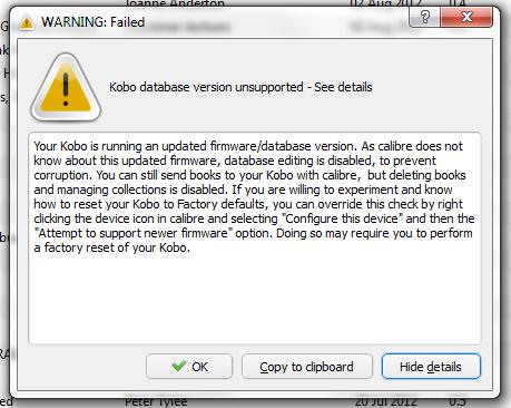Yes I know there are posts elsewhere but they seem to just peter out ? My Kobo is using the older firmware 1.9.17, and I didn't try to update it because of the problems. I haven't used my Kobo Desktop software for the same reason. My Kobo has been working fine until today when I plugged it in to transfer some books to it from calibre. calibre is running 0.8.62, but I don't know which version it was running the last time I had my Kobo connected to it ? I tried uninstalling calibre and reinstalling 0.8.61 but still get the fail message. But I notice that calibre still has all the books in it's Library, so obviously t wasn't a "clean" reinstall. Would a clean reinstall of an earlier version of calibre fix the problem, and how do I do that please ? |