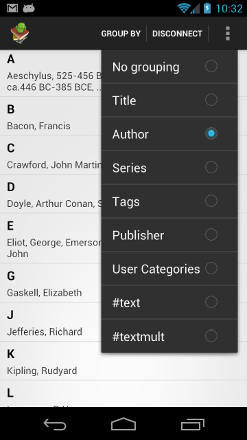 4: Grouping. The display behind the menu is grouped by author. If you tap on a letter line you will see a list of authors beginning with that letter. Tapping on an author takes you to books. Tapping "User Categories" takes you to the list of sony-style collections. This item does not display if no collections are defined, which is the default. The two items at the end are lookup keys for custom columns I chose to use for grouping.