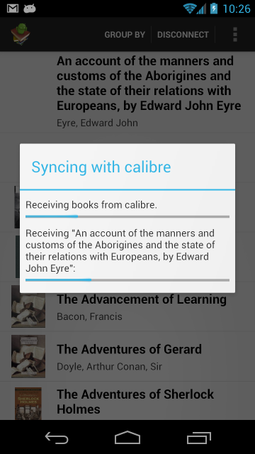 1: Books sorted by title. This is the initial view when starting the app. 2: Book sorted by author 3: Transferring from calibre. There are two progress bars, one for where the app is in the series of books, the other for the book being transferred. The author is visible in the book progress bar because that book's title contains the author's name. 4: Grouping. The display behind the menu is grouped by author. If you tap on a letter line you will see a list of authors beginning with that letter. Tapping on an author takes you to books. Tapping "User Categories" takes you to the list of sony-style collections. This item does not display if no collections are defined, which is the default. The two items at the end are lookup keys for custom columns I chose to use for grouping. |