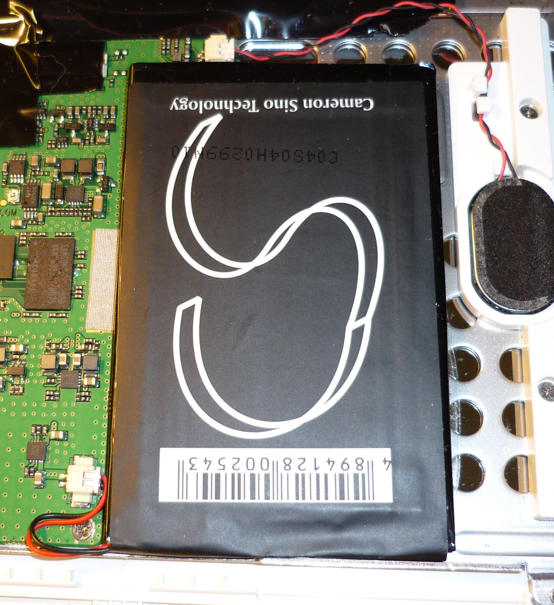 The battery is glued in with glue stripes on top and bottom (the wide sides) of the battery, and the glue was rather strong in my case. What's more, there is a big hole in the metal frame below the battery where the display is unprotected. So if you try to lever out the battery with a screw driver you can easily crack your display in the process if you didn't know about that hole beforehand. So make sure whatever you do to get the battery out, never try to get any leverage from the middle. Only work at the very sides of the battery. I'd suggest you simply pull hard on the cable of the battery itself, except it may break and you become unable to reuse it for your new battery. The following picture is from a Story HD Basic with already cracked display I bought from Ebay for spare parts (I finally fixed my bricked Story HD today, yay). I gave the glue stripes a green tint because they were not easy to see in the image otherwise (sorry for low quality). |