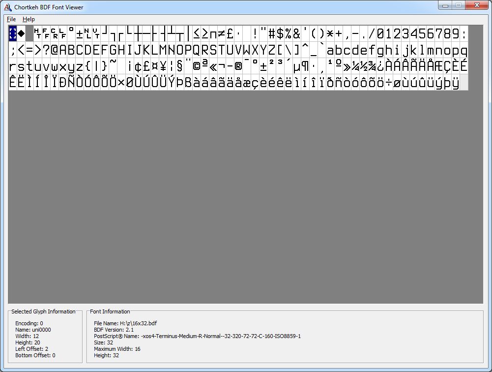Easiest routes would be a) check the bdf is not garbage with a validator - I am not aware of one off hand b) get another bdf and try that. I opt for this one myself. I searched for about two days on and off before I dredged up the 12x24 one and the 16x32 is part of the terminus project but IIRC they dont supply a native bdf. Fondu? or similar... may be our friend here? It converts quite a few bits and have toyed with it locally to get a feel for its abilities but again its not something I can just do. It would be nice to get a huge font. If only for the accessibility of it. Also it is there to be done. What more reason is there? |