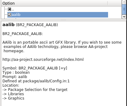 Okay so to the thrust of this post: Adding new packages 101 - Customising BR. (It's easy, honest). the main docs are here: http://buildroot.uclibc.org/download...s_to_buildroot This reallife guide is what I intend to take the project where knc1 wanted. The guide: We assume that you have some knowledge. ${foo} is a reference to a variable. you would test conditions like if(${foo}) blar endif read up on Makefile and configure files. that will help. Including AALIB in BR... mkdir /home/you/GIT/buildroot/package/aalib cd /home/you/GIT/buildroot/package/aalib nano -w aalib.mk Spoiler: