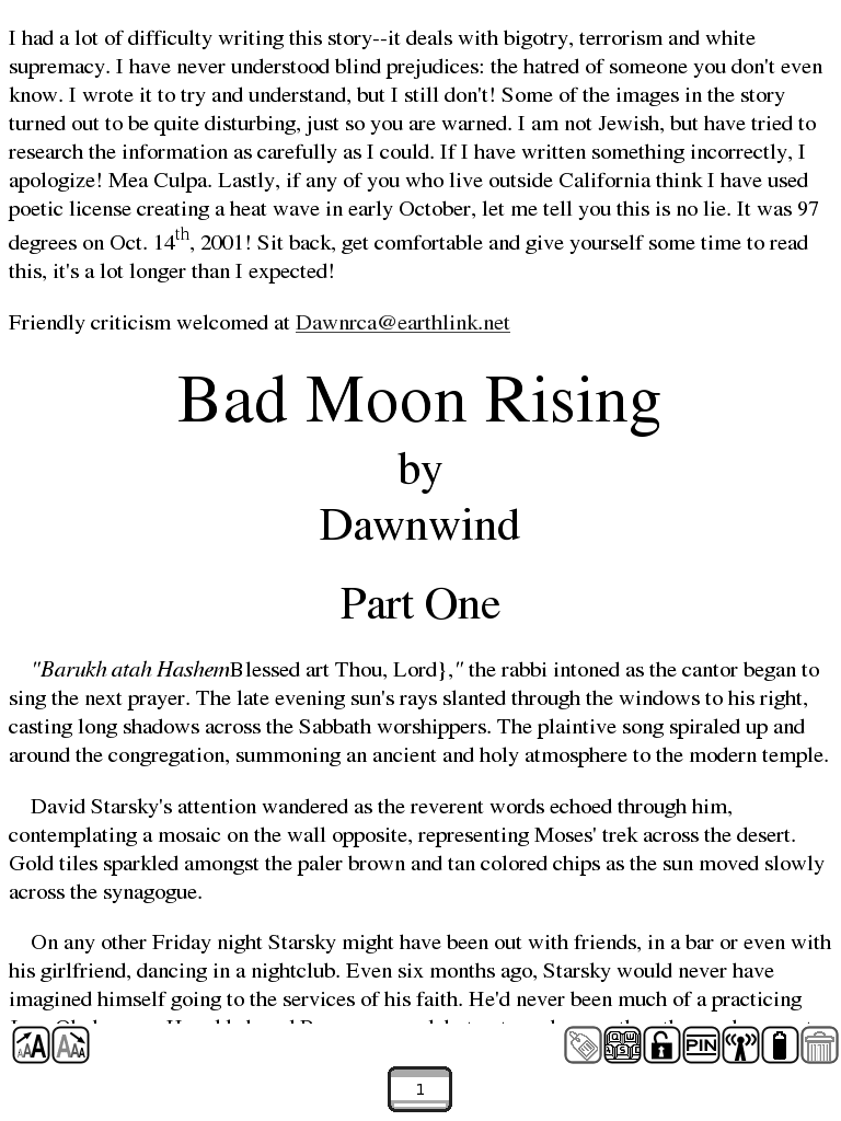 That was really helpful.How much slower is the page turn with FBReader? I think I'd get tired of it over time if it was over 3 sec. I think I'm going to buy an iLiad because I want a larger screen, and I'd be really surprised if Astak get the large Mentor out before next year. But given what you said, I think my best option is to create PDFs. I just now tried to create mobi files from some randomly chosen story files I have saved, and 2 out of 3 didn't really work. In many cases the basis is really bad, automatically generated code and/or with tables. I already spend quite some time on cleaning up the html files - it's quicker to copy into Word or Pages and create PDFs - but they didn't work so well on the CyBook... |