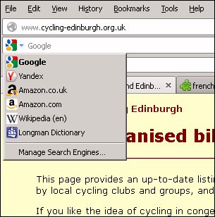 Just to be clear: I want to add a French dictionary to the Firefox search toolbar, so that it is visible from the drop-down menu within the toolbar. See the screen shot, below. You can see I've already added Longman's English dictionary to the toolbar. I now want to add something similar for French. I'd be happy with either an all-French dictionary (where the headwords and the definitions are in French) or a French-English dictionary (which translates a French term into English). Thanks in advance for any suggestions. Mike |