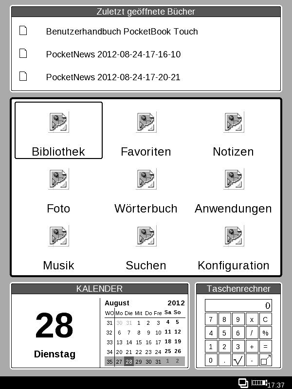 also es ist alles etwas merkwürdig. 1. Ein Reset bewirkt eigentlich nichts, der oben gezeigte Homescreen erscheint auch dann wieder. 2. Ein löschen der Themes ist nicht möglich, Dateien sind schreibgeschützt, somit kann ich nicht aufs Standardtheme zurück (Betriebssystem Linux Mint) 3. Der tip mit der Firmware bringt mich insofern weiter, das ich nach einem Firmwareupdate über SD-Karte wenigstens wieder mein StandardTheme bekomme. Ich poste hier nun mal die Daten nach dem Fimwareupdate: Modell: Pocketbook 622 Seriennummer: xxxxxxxxxxxxxxxxxxxxx Hardwaretyp: ep7 Softwarerevision: D622.3.2.108 20120405_180048 RAM-Größe: 128MB Parameter des E-Ink Bildschirms: default Allerdings habe ich das gleiche Problem nachdem ich wieder das CrystalB+I+P Theme auswähle(CrystalW+i+p funktioniert!), einzige Lösung bis jetzt erneutes Firmwareupdate über SD. Gruss Eugen |