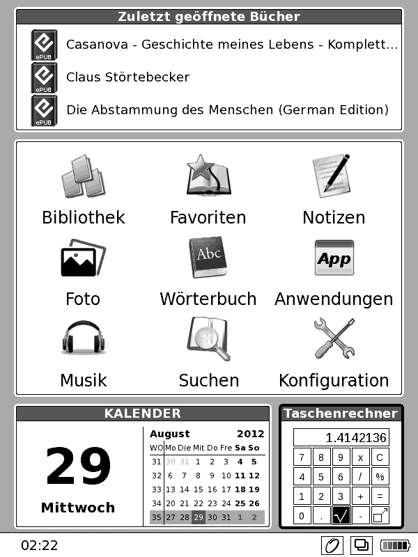 also es ist alles etwas merkwürdig. 1. Ein Reset bewirkt eigentlich nichts, der oben gezeigte Homescreen erscheint auch dann wieder. 2. Ein löschen der Themes ist nicht möglich, Dateien sind schreibgeschützt, somit kann ich nicht aufs Standardtheme zurück (Betriebssystem Linux Mint) 3. Der tip mit der Firmware bringt mich insofern weiter, das ich nach einem Firmwareupdate über SD-Karte wenigstens wieder mein StandardTheme bekomme. Ich poste hier nun mal die Daten nach dem Fimwareupdate: Modell: Pocketbook 622 Seriennummer: xxxxxxxxxxxxxxxxxxxxx Hardwaretyp: ep7 Softwarerevision: D622.3.2.108 20120405_180048 RAM-Größe: 128MB Parameter des E-Ink Bildschirms: default Allerdings habe ich das gleiche Problem nachdem ich wieder das CrystalB+I+P Theme auswähle(CrystalW+i+p funktioniert!), einzige Lösung bis jetzt erneutes Firmwareupdate über SD. Gruss Eugen |