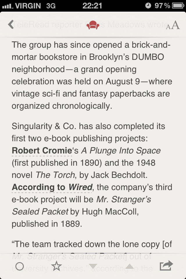 You are perhaps right that readers should be given the option to change settings to suit themselves. I just find it difficult to get worked up over the absence of this feature when the current reading experience is pretty close to ideal, especially compared to alternatives like iBooks. Hyperbole about "awful," "unreadable" text just makes me chuckle.  |