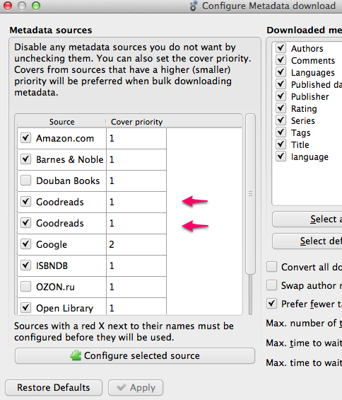 calibre, version 0.9.2 ERROR: No matches found: <p>Failed to find any books that match your search. Try making the search <b>less specific</b>. For example, use only the author's last name and a single distinctive word from the title.<p>To see the full log, click Show Details. Running identify query with parameters: {u'authors': [u'Rob Thurman'], u'identifiers': {u'isbn': u'9781451652222'}, u'timeout': 30, u'title': u'All Seeing Eye'} Using plugins: Goodreads The log from individual plugins is below ****************************** Goodreads ****************************** Request extra headers: [('User-agent', 'Mozilla/5.0 (Windows NT 6.1; Win64; x64; rv:2.0.1) Gecko/20100101 Firefox/4.0.1')] Found 0 results Downloading from Goodreads took 3.79100012779 Querying: http://www.goodreads.com/search?sear...e=books&search[query]=9781451652222 ISBN match location: u'http://www.goodreads.com/book/show/13260196-all-seeing-eye' Goodreads book url: u'http://www.goodreads.com/book/show/13260196-all-seeing-eye' Could not find title/authors/goodreads id for u'http://www.goodreads.com/book/show/13260196-all-seeing-eye' Goodreads: u'13260196' Title: None Authors: None ************************************************** ****************************** The identify phase took 3.81 seconds The longest time (3.791000) was taken by: Goodreads Merging results from different sources and finding earliest publication dates from the xisbn service We have 0 merged results, merging took: 0.00 seconds Last edited by Japes; 10-19-2012 at 07:21 PM. |