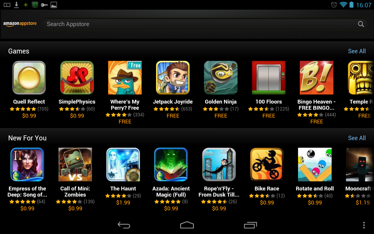 It almost beggars belief that the US amazon App store is almost as thread bear as the UK store and amazon think they could take on both google and apple with there lobotomised operating system(OS) tablet/media player,what should i call it?Amazon could do a lot better and provide a much better device & service overall if they just bite the bullet and embrace ANDROID instead of trying to work against it. Now that i have finely seen the both App stores and what little they have to offer it makes total sense why so many kindle fire owners where griping or ROOTING there devices so they could CHOOSE where and what they bought as well as VASTLY increasing the quantity of media & Apps to buy. Unless amazon ramps up there currently none existent streaming services and poorly stocked App store in the UK & the rest of Europe customers will be almost stuck in no man's land for renewable media for some time to come. Last edited by darksaber35; 09-09-2012 at 02:30 PM. |