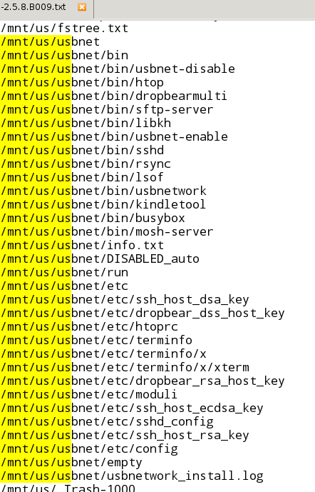 I'm fairly sure most of nilujes hacks can work this way (FAT destroyed? just replace it) okay - your other point... find / > /mnt/us/fstree.txt I' am currently providing you with one of them (WHICH IS A LIST OF FILENAMES ONLY) Nothing wrong with that... It's not "Clean" (I don't have a virgin 2.5.8 but this is pretty close) however it works fine and will probably be what you need. You can clearly see from the listing that I have removed all personal listings (like books and stuff) but I left in everything else. I see no issue in providing a list of filenames. so I have. Hope you get your issue sorted. |