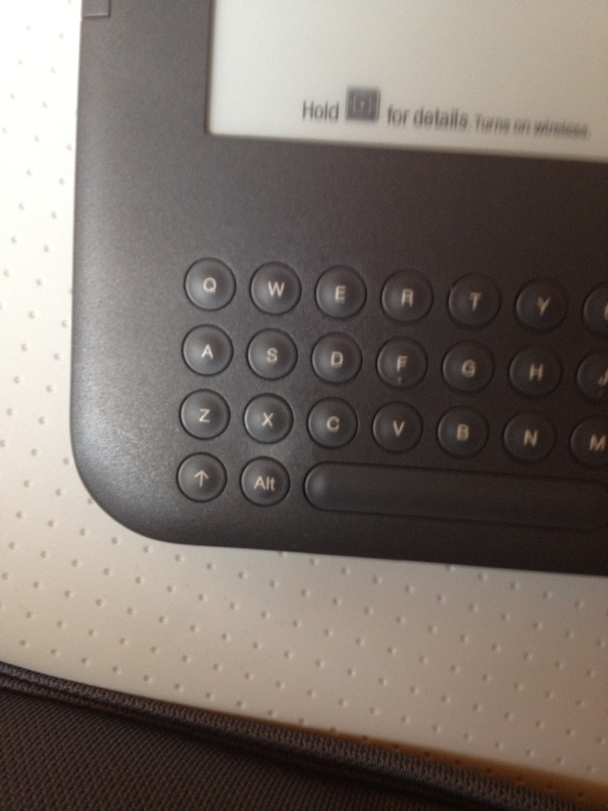 Hi all--my mom is selling her Kindle 3G, Special Offers edition, graphite. It's in decent condition (a little cracking around the ALT key, and possibly in the bottom corners of the bezel, but not too visible). In any case, it's in good shape.