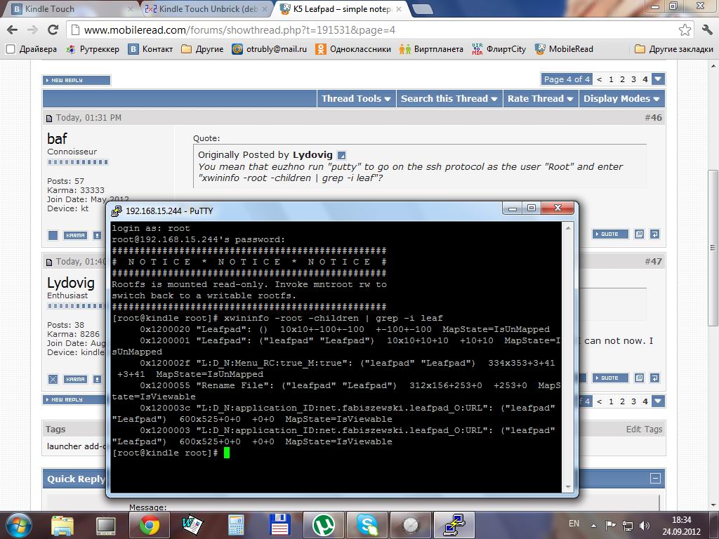 root@192.168.15.244's password: ################################################# # N O T I C E * N O T I C E * N O T I C E # ################################################# Rootfs is mounted read-only. Invoke mntroot rw to switch back to a writable rootfs. ################################################# [root@kindle root]# xwininfo -root -children | grep -i leaf 0x1200003 "L _N:application_ID:net.fabiszewski.leafpad_O:UR L": ("leafpad" "Leafpad") 600x525+0+0 +0+0 MapState=IsViewable0x120002e "Leafpad": () 10x10+-100+-100 +-100+-100 MapState=IsUnMapped 0x1200001 "Leafpad": ("leafpad" "Leafpad") 10x10+10+10 +10+10 MapState=IsUnMapped 0x1200033 "L _N:Menu_RC:true_M:true": ("leafpad" "Leafpad") 334x353+3+41 +3+41 MapState=IsUnMapped0x1200058 "Rename File": ("leafpad" "Leafpad") 312x156+280+0 +280+0 MapState=IsViewable 0x120003e "L _N:application_ID:net.fabiszewski.leafpad_O:UR L": ("leafpad" "Leafpad") 600x525+0+0 +0+0 MapState=IsViewable[root@kindle root]# |