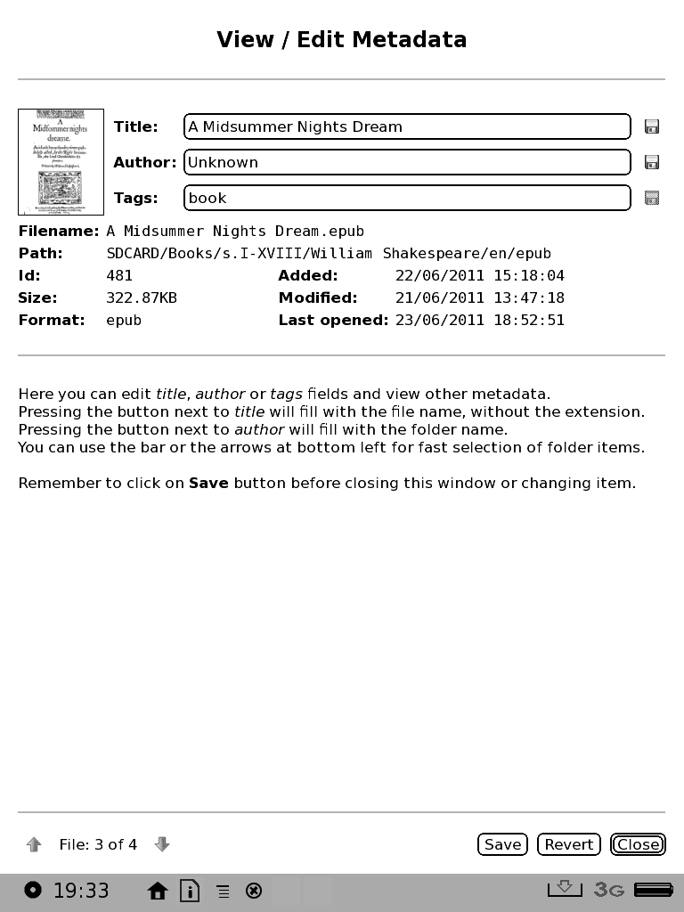 The reason is because Inbox Manager has been/is/will be obsoleted by Navigator (and metadata in the DR, btw). OK, I will explain this. My (future) workflow for new books added to the DR: I've configured DR to disable automatic thumbnail generation -> connect with usb and copy new books in proper folders -> run Navigator -> Go to Recently Added virtual folder (configured with 100 max items) -> select books and edit: one by one or in batch mode (bulk) -> fix title and author, generate cover thumbnail, set tags Ok, this is the idea We are almost there, I've already written the code to edit book metadata one-by-one (working superbly), and this weekend I'll write bulk edit. Later I have to study Mackx's hack to see how he implemented multiple tags in global.db, and then add it to DR800+ and Navigator. I think this will be the hardest part. Sound ok to you? ideas? Iņigo EDIT: added a screenshot. Doesn't it look gorgeus?