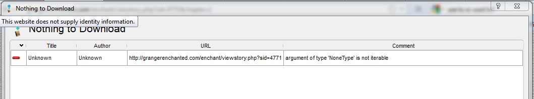 Hey there! I've been having trouble with one story from one site, and can't figure out what's wrong. I had downloaded it and updated it successfully up through about 19 chapters, then it stopped working when I tried to update from chapter 20 on. I deleted the original story from my library, then tried to download it from scratch, and it gives me the error attached below.
