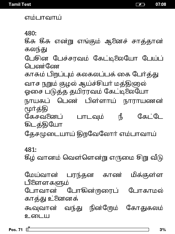 @ixtab, are you able to see the tamil fonts? What font hacks have you installed? Thanks. I am able to read this in Calibre. But when I open it in my Kindle 4 it shows junk characters and not the tamil fonts?