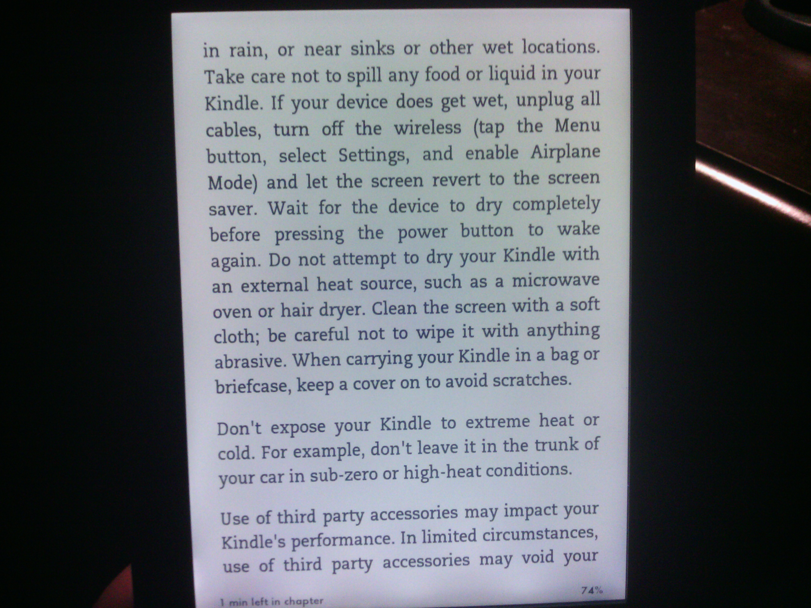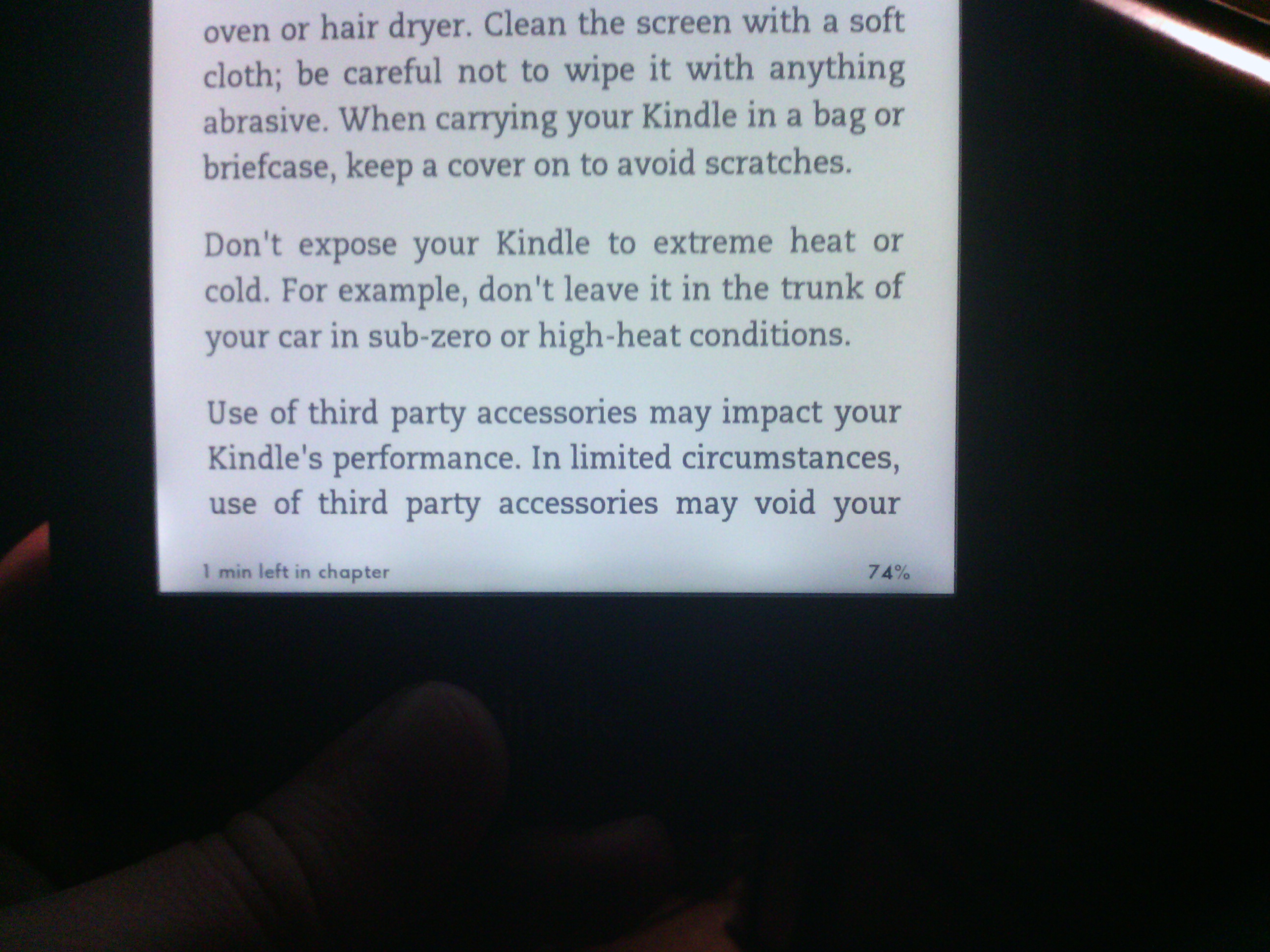 I see what every one means by the blotchiness (you can see the pattern of the lights at the bottom) HOWEVER - what you don't see is the screen bleed like the nook glow. I generally keep the light dim (same for the nook glow), and it doesn't appear to be too noticeable at that level (it's at about 7 right now). Even low with the nook glow, there is a band of light around one side, which thankfully the kindle lacks. What disappoints me though, is the screen itself (when the light is off) isn't as white as the new non-touch black. The contrast is definitely much better on the non touch black. Kind of surprised by how heavy it feels (in comparison to the non touch), page sync didn't work for me either, but a cool thing is that when you have it in the case and close the cover, the light stays at the same level when you wake it up. That's much nicer than having to hold a button for three seconds, like on the nook. |