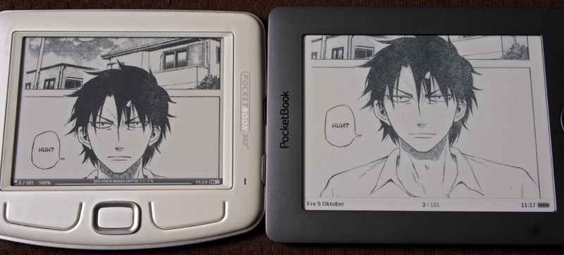 Beim ersten Bild habe ich noch gedacht, daß es nur an der Farbtiefe liegt. Der PB360 hat nur 4 Farben, neuere Reader 16. Bei einem "bunten" Cover muss der PB360 daher deutlich mehr Farben in echtes schwarz übersetzen, was bei einem 16 Graustufen Reader dann eben ein hellerer Grauton wird.