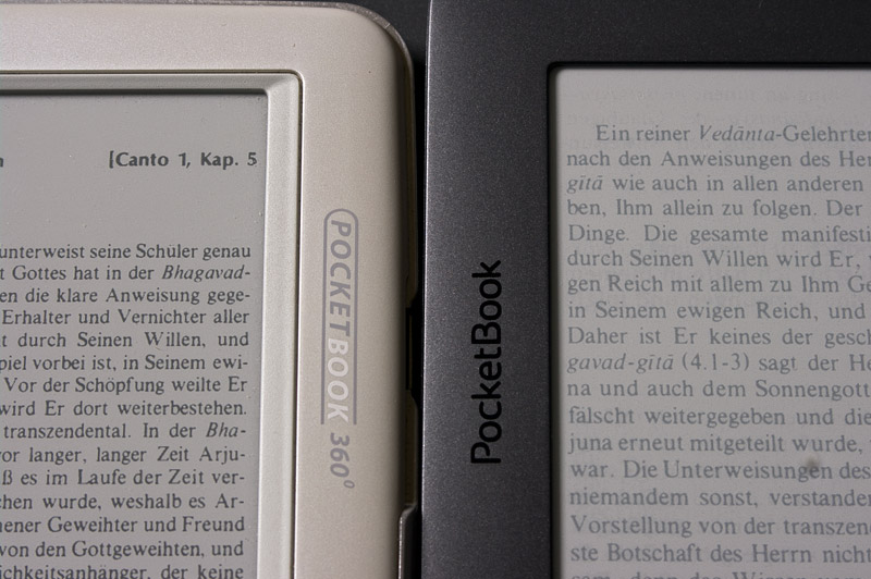der äußerst attraktive Preis des 613 Basic führte dazu, daß ich einen gekauft habe. Der Reader ist als Geschenk gedacht, da mein mittlerweile nun auch schon fast drei Jahre alter 360 noch immer klaglos funktioniert. Die deutlich höhere Blättergeschwindigkeit und der größere Bildschirm des 613 haben dieses Gerät aber auch für mich selbst interessant werden lassen, so als Heimgerät (und der 360 dann für unterwegs), da ich keine Funktionen wie Wlan oder Mp3 brauche. Aber: bei einigen PDFs hat sich gezeigt, daß der 613 deutlich blasser darstellt Frage also: ist dies technisch bedingt, also nicht zu ändern? Der Bildschirm des 360 ist zwar minimal dunkler. aber wenn ich das mit der I-ink-Technik richtig verstehe, sollte es daran nicht liegen. Es erscheint eher so, als würden die Partikel nicht weit genug hochgezogen? Ein von mir selbst erstelltes PDF (nicht gescannt, sondern aus OpenOffice heraus) sieht denn auch wesentlich kontraststärker aus. Dies zeigt das letzte Foto. Beim 360 ist auf den Fotos übrigens auch der Adobe-Reader eingestellt, da man beim 613 ja nicht wählen kann. |