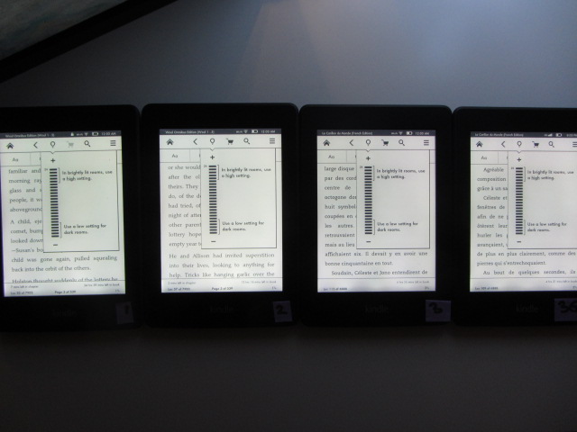 Has anyone seen one with an even background yet? I received two today, and am comparing them back and forth wondering which one is the lesser evil. Maybe I should try one more time to replace them? I tried to take a pic of the colorations, but no matter what I do, my camera auto-adjusts. The attached pics are just to show the difference in brightness and font contrast and stroke boldness. They are at the same light settings and same font. It literally gets bolder in the order that I received them, with the last one on the right having the boldest font. The first and second one are also brighter and, maybe because of it, the font shows less contrast. Last edited by xendula; 10-10-2012 at 09:48 PM. |