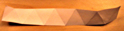 Give it a half twist and join the ends. You now have a Möbius strip - a piece of paper where the flat area is all one side. Join the ends without a half twist and you just have a loop, with the flat area is two sides. How can you turn a strip of paper into something with three flat sides? (No cutting, and with just one join, as in the previous two examples.) |