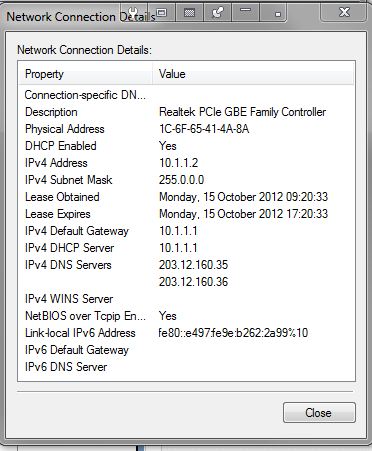 I'll assume its 3 Go to Control Panel\Network and Internet\Network and Sharing Center You should see a link under the Internet Globe to Local Area Network Click it and a dialogue box will appear showing traffic volumees (bytes sent & received) and a Button called Details - Click this button and you should see, something like this If DHCP Enabled is No then - that's something that makes me go Hmmm If DHCP Enabled is Yes then check out the TCP/IP configuration by following this MS link http://windows.microsoft.com/en-US/w...CP-IP-settings If DHCP is not enabled, could you explain why so. If you have something odd in your TCP/IP configuration then I cant imagine why Calibre should be sensitive to it and not your browser, email client, ITunes and all the other stuff that calls home to look for updates etc etc, do you run a torrent client or FTP client - are they all OK ? BR Last edited by BetterRed; 10-15-2012 at 07:56 AM. Reason: Image went awol |