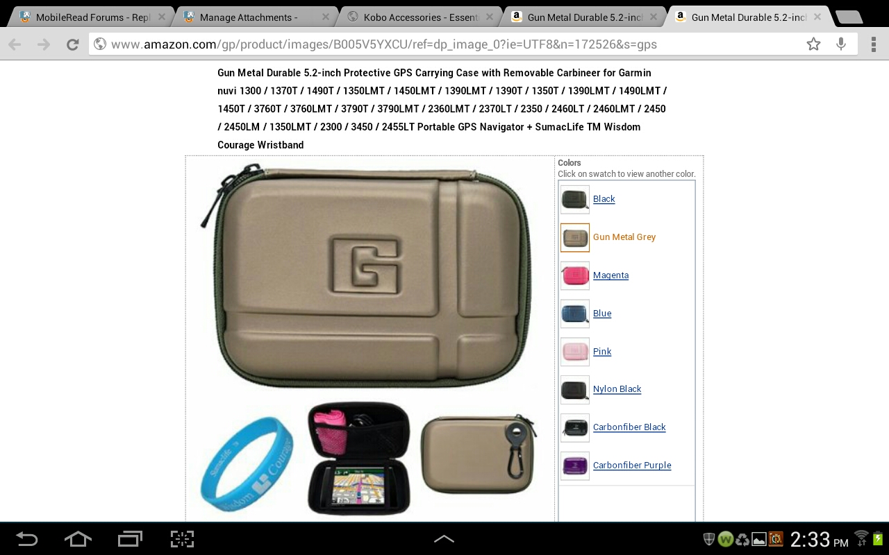 I'm thinking for cases to go with the Kobo Mini, I will probably do like I did for my Sony PRS-350. Case Logic made a cd wallet that fits the reader fine. I believe it has 16 cd inserts. Anyway, I remember paying $4.99 for the case, Best Buy had them in red, blue and black. I gutted it except for a couple of inserts in the back to provide cushioning. Granted the depth was much more than I needed, but I made use of the extra space. I place my 350 in, then a piece of microfiber cloth, on top of that I place another insert that had been removed. I still have plenty of room, so I pack in my iPod Nano ( the square one), headphones and the USB cord for the reader. It all fits fine and I can grab the case and head for the gym.