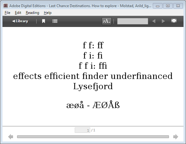 @ManEatingDuck—I feel edified. Thank you! Now that you explain it, the term "ligature" makes perfect sense, and feel a little silly for not having figured it out myself... but only a little. So from what you've seen, is ADE also stripping out letter ligatures or just stylistic ones. And when you say they are "stripped out" does that mean that "æsthetically" will render in ADE 2.0 as "aesthetically" or will it render as "sthetically"? I recently created a book that had a lot of Nordic names and dialogue, and consequently used the letter ligatures frequently. Am I going to need to go back and mess around with that?