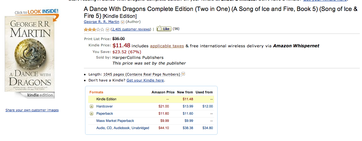 Thanks for the explanation of the 3G surcharge. I've taken screen shots of two reasonably popular books. HarryT, That's not really what I meant, it just so happens that I was having a look at Amazon's prices again recently because of the new Paperwhite. I only know that prices are higher now than I remember them to be in general, can't say how long they've been like this. I don't remember any exact prices but it used to be that Amazon was quite consistently better on pricing. I should say that not all books on Amazon are more expensive, but it seems that most of the more popular ones are. Of the few I've seen that are cheaper, I've noticed that none have the 'This price was set by the publisher' message. |
