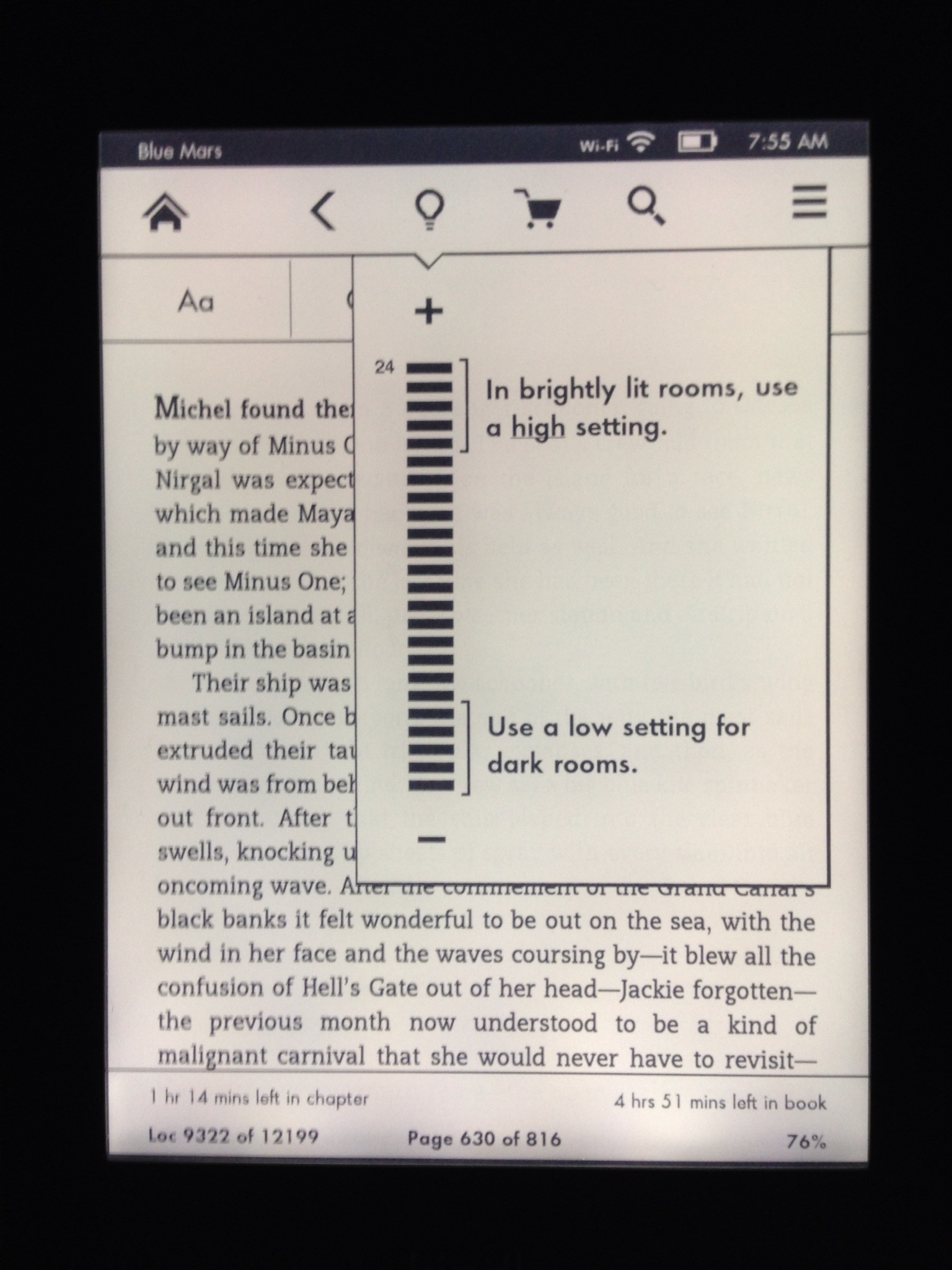 is way better than KPW. Or will use Nexus 7 in nite mode or low lite settings.
