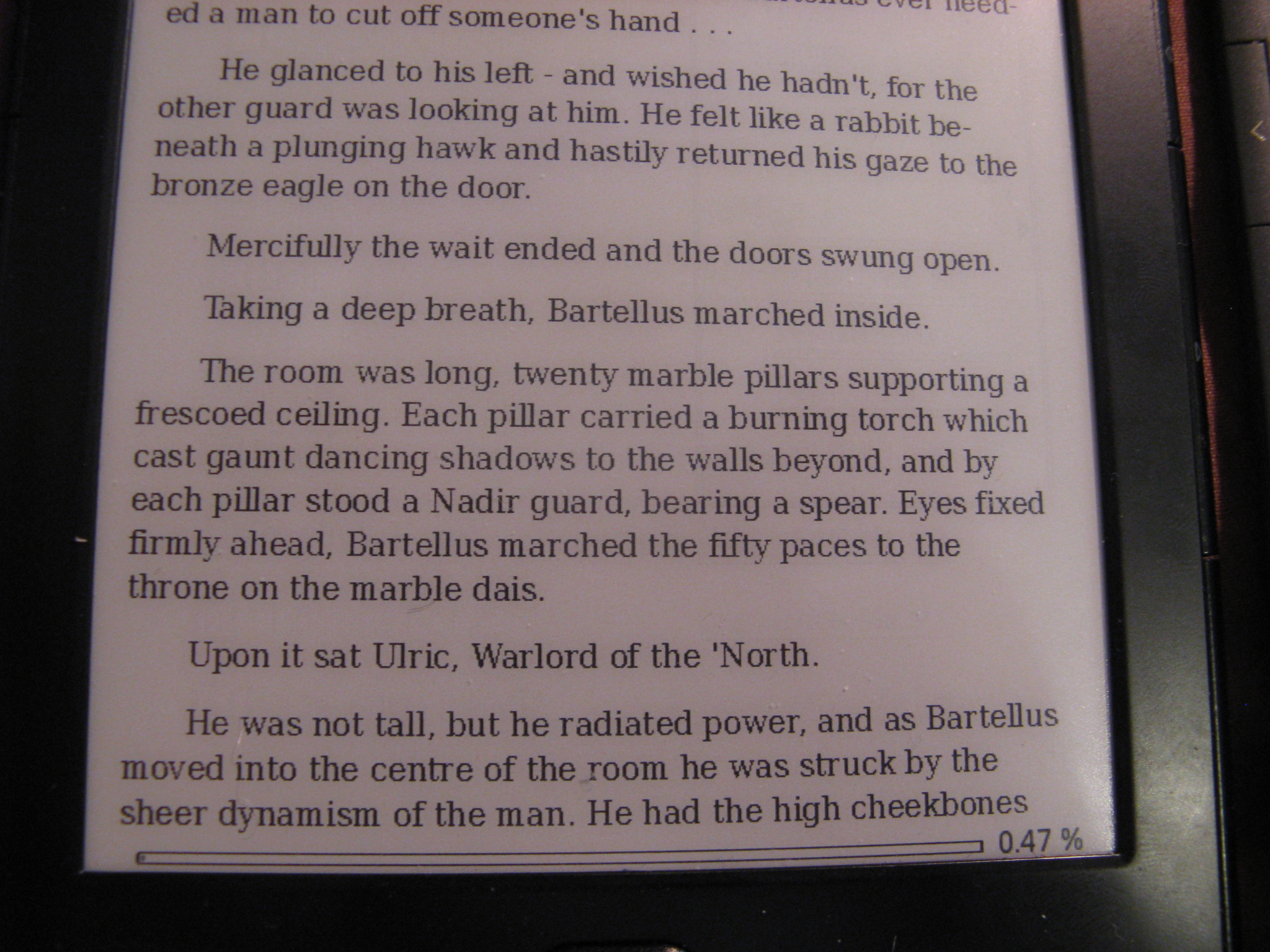 I just opened Duokan in my K3 with the lowest "black" option and a random font. I then took two pics of my K4NT with Duokan 2012 (just OTA updated). The first one is the "best" I could do, after toggling all the available options and it's still worse in reality than what you see in the picture. The second is a "representative" picture of most fonts, this is what you see. Duokan 2012 has very "thin" letters that seemed washed out and not very black-grey. Last edited by GlassX; 10-22-2012 at 05:56 AM. |