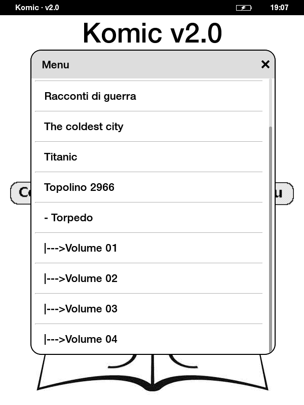 The drawback is still there, but it looks cool (IMHO!!). Anyway, next release will have also the cover view, so you can choose which to use! In the meanwhile I'm studying how to create a custom menu using Kindle's own system! Screenshots explanation: - first screenshot is taken immediatly after Komic has loaded - second screenshot is taken after having tapped on Torpedo |