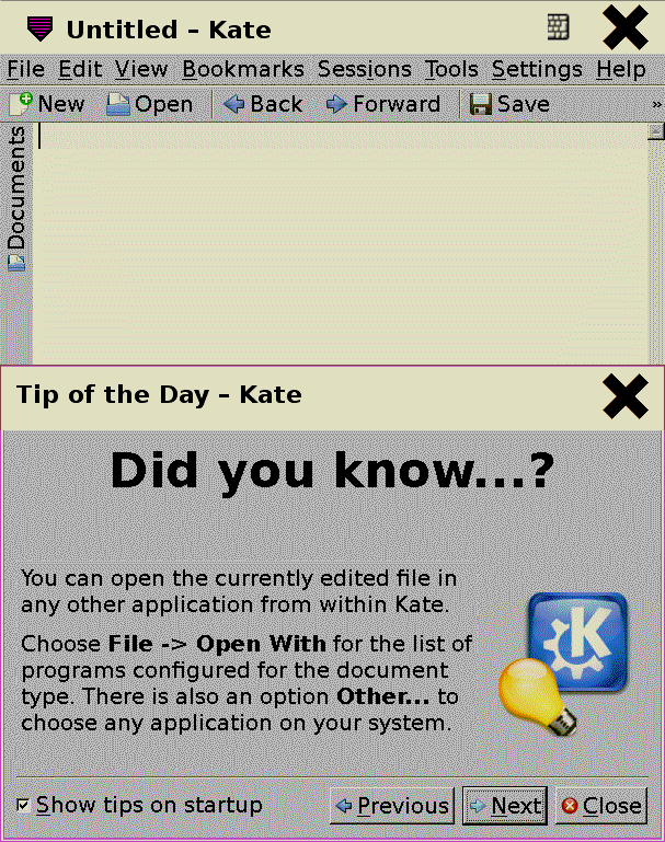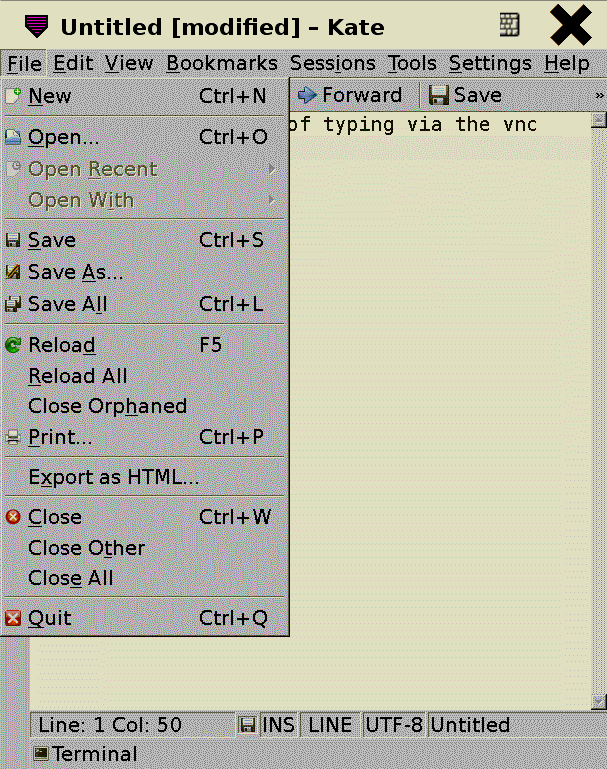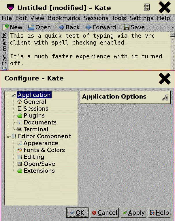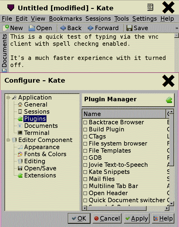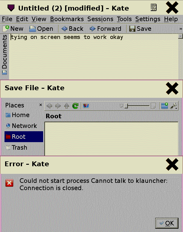 next up Kate. Now this one has some real issues atm. I would have to look into also having bits of kde working (klauncher for example) I have documented the errors.