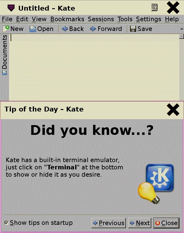 next up Kate. Now this one has some real issues atm. I would have to look into also having bits of kde working (klauncher for example) I have documented the errors.