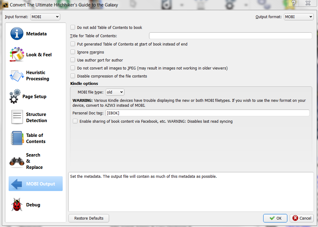 Thanks. Will try it when I get home. Your MOBI output settings are similar to mine, except for the Personal Doc Tag which I have PDOC for. But does that get rid of the banner or just lets the Kindle recognize that they're books and not documents?