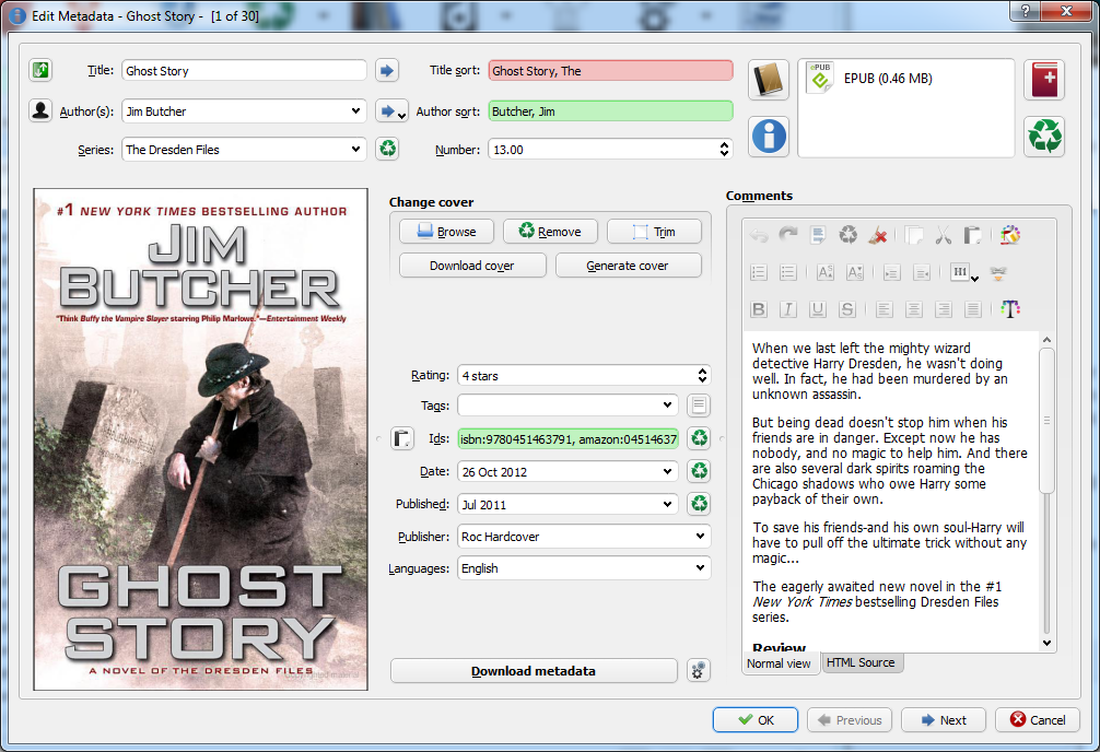 I am trying to export my library to disc, and noticed that despite me having set the save to disc to use title, it uses title_sort instead. Also, on a slightly different note there is another thing i noticed that may or may not be intentional behavior. I have a Metadata plugboard that updates the epub title and epub title_sort to add the series and series index to the beginning of the title and title sort when i save it to disc. Doing that updates the metadata .opf file within the epub archive, but it doesn't affect the actual name of the file. So even though the metadata says the title and title sort is: <meta name="calibre:title_sort" content="The Dresden Files 13 - Ghost Story"/> <dc:title>The Dresden Files 13 - Ghost Story</dc:title> the title part of the file name as exported is still just "Ghost Story". Again, that may be intentional, I don't know, but it's not how i would expect it to behave. I'm using Calibre 0.9.5. I tried to report this to the Calibre bug site but the tracker wouldn't let me register for some reason. This isn't exactly an urgent bug, but if possible i would like to see it fixed. Thanks. |