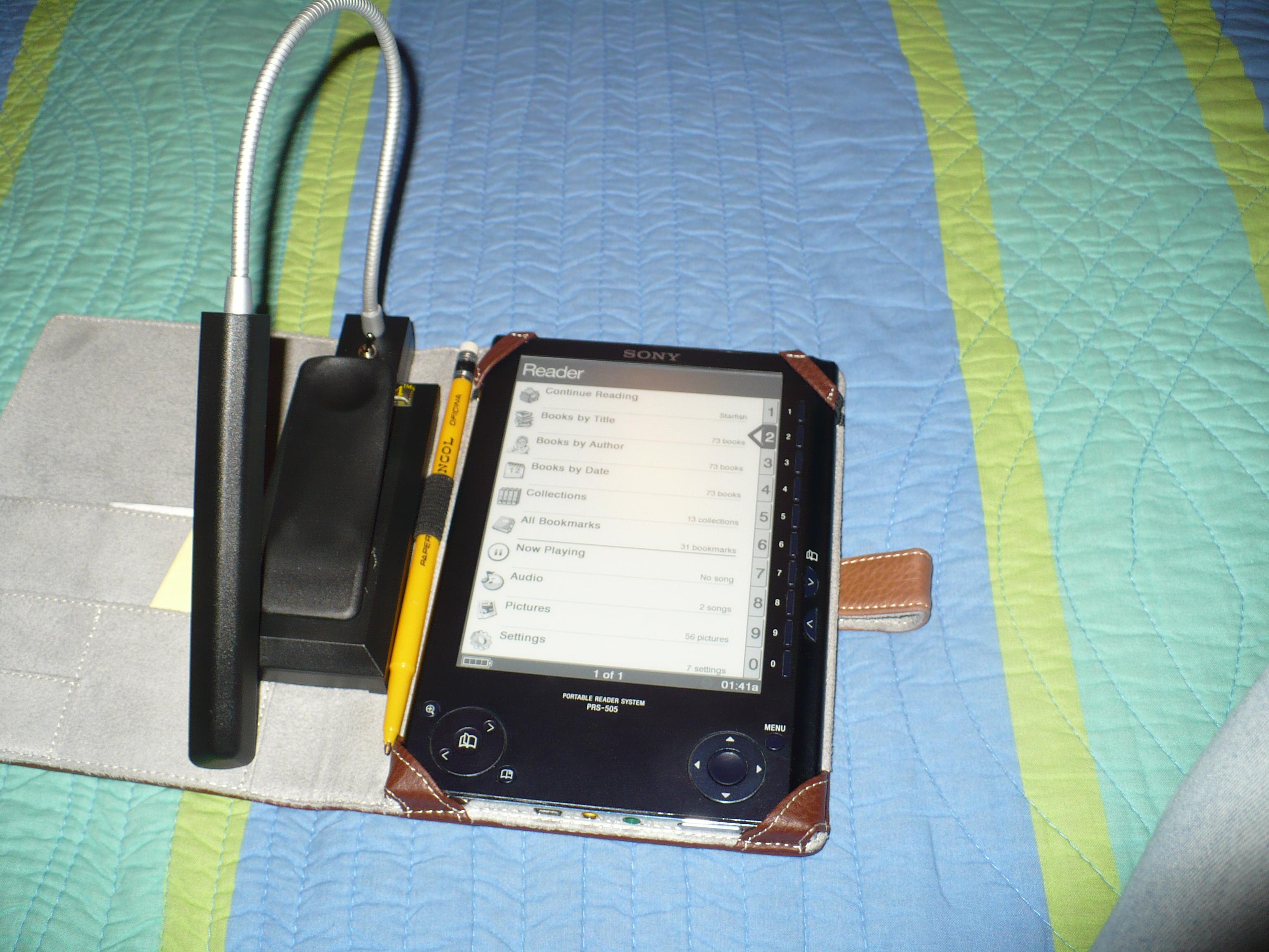 What I love about this light is that it gives a perfectly even light distribution across the reader screen. There is, of course, an LED beam spot, but it's tiny and I just aim it at the bottom (metal) part of the reader so the actual screen is evenly lighted. It also feeds off two AA batteries (rechargeables are OK, they last a while, but can't be more specific than this) and it is compact -- the LED and the stick it's attached to can be detached from the battery base and clipped onto its side. What I don't like is that the light-stick wasn't made collapsible so that when it's attached to the side of the battery bay it's the same height. Also, when I bought the light it was $19.99 + free shipping at the goinginstyle.com, however they have (about 5-6 lights I bought) later realized they made a pricing mistake and raised the price to $39.99 which could be considered steep, until you see the light in action. I don't have the home-made pictures yet, here's the one posted at the online store I bought the lights from: http://www.goinginstyle.com/AC/Zelco...ght-P1962.aspx I will try to make and attach some pictures later on. |