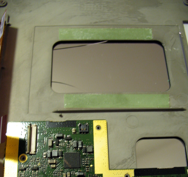 The battery is glued in with glue stripes on top and bottom (the wide sides) of the battery, and the glue was rather strong in my case. What's more, there is a big hole in the metal frame below the battery where the display is unprotected. So if you try to lever out the battery with a screw driver you can easily crack your display in the process if you didn't know about that hole beforehand. So make sure whatever you do to get the battery out, never try to get any leverage from the middle. Only work at the very sides of the battery. I'd suggest you simply pull hard on the cable of the battery itself, except it may break and you become unable to reuse it for your new battery. The following picture is from a Story HD Basic with already cracked display I bought from Ebay for spare parts (I finally fixed my bricked Story HD today, yay). I gave the glue stripes a green tint because they were not easy to see in the image otherwise (sorry for low quality). |